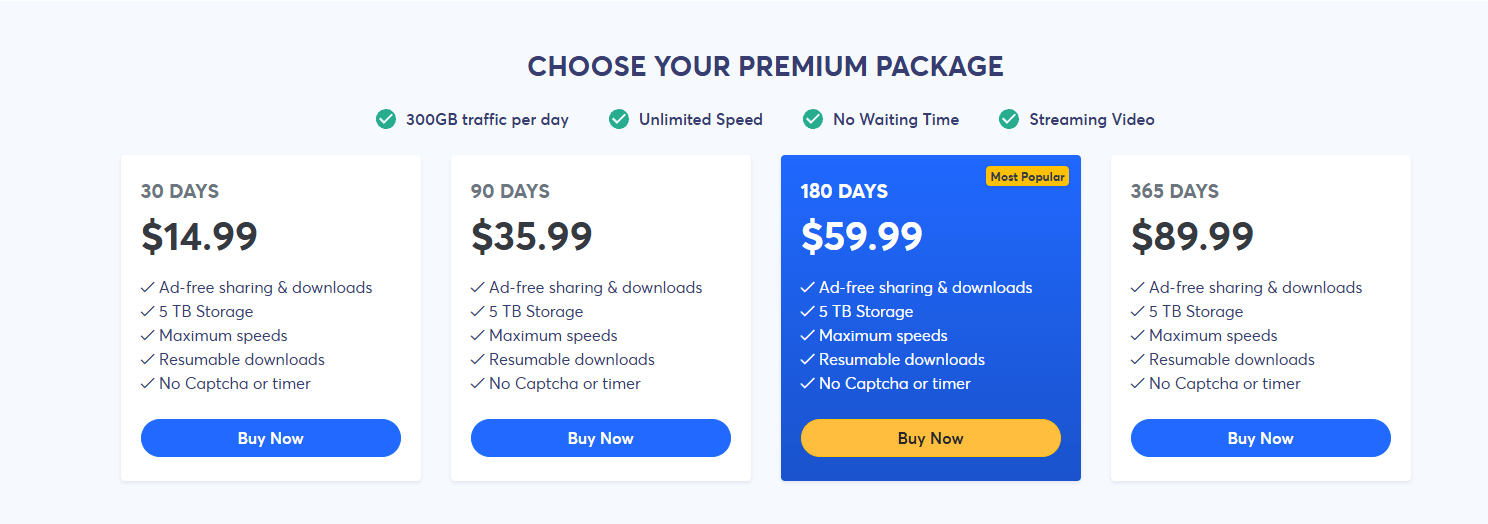 - 30 Days – $14.99: 5TB storage, ad-free sharing, max speeds, resumable downloads.