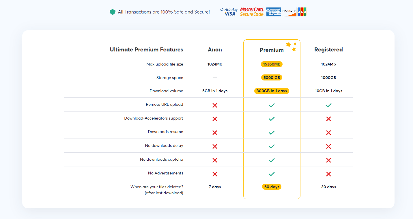 - 300GB daily traffic, unlimited speed, no waiting time, streaming video support, remote URL upload, download accelerators, resumable downloads, no captcha, and no ads.